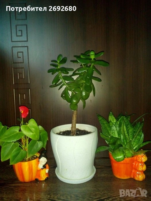 Сансивиера, която на снимката е заедно с дървото на живота по средата и червен антуриум, има я и на друга снимка в красива оранжева кашпа, има много растения с отделни корени в една саксия, височина на растенията заедно със саксията - 40см., цена заедно с оранжевата кашпа - 10евро;