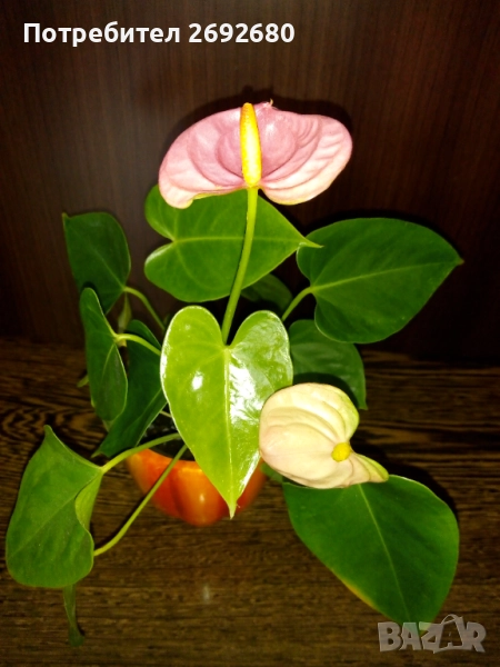 Антуриум червен, височина на растението заедно с керамичната кашпа - 35см., цена заедно с керамичната кашпа - 15лв.