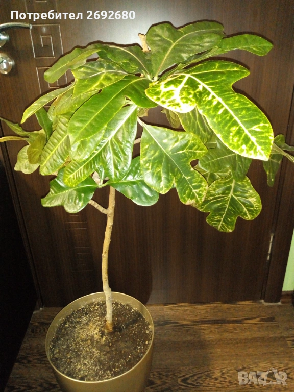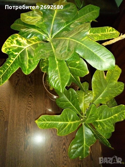 Планински кротон с красиви шарени листа от последните снимки е над 15-годишен, височина заедно със саксията - 1метър, има дебело стъбло и отгоре няколко разклонения с дъбовидни големи листа. Цена на кротона - 100лв.