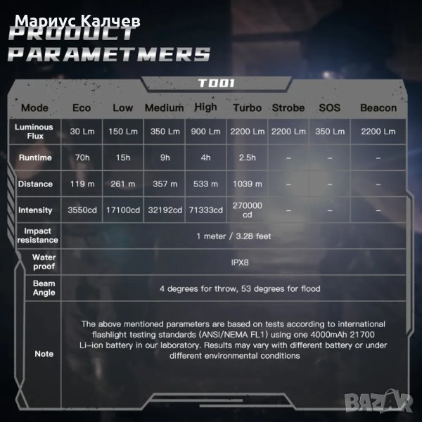 5. Опции за батерия: 1x 21700 Li-Ion батерия /включена в цената и комплекта/.