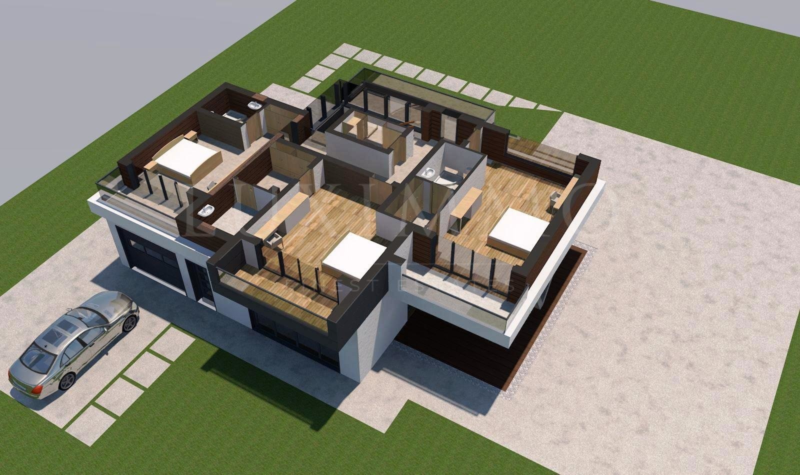 Общата площ на имота от този тип е 340 кв.м и е построен върху парцел от 682 кв.м. Разполага с хол с трапезария, две спални, една детска стая всяка със санитарен възел, покрита веранда и гараж.