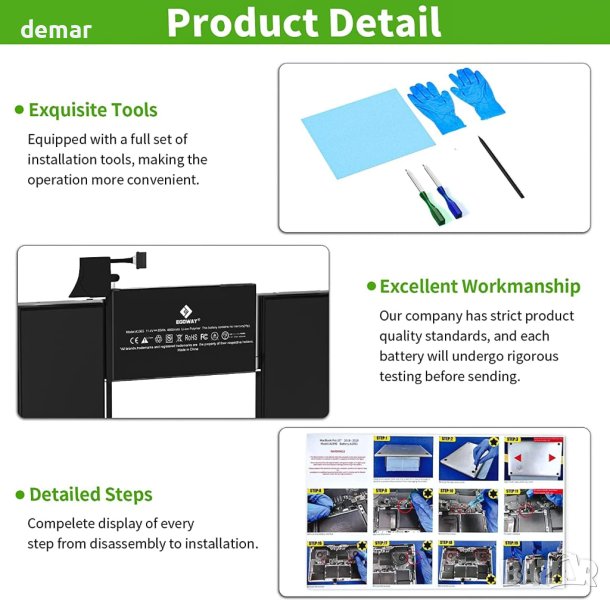 Проверете за съвместимост, преди да закупите нашата батерия за лаптоп A1965, като проверите модела и годината на вашия Mac. С литиево-полимерен състав и 11,4 V напрежение, тази 4800 mAh/55 Wh батерия е надежден източник на захранване за вашия Mac Book Air 13 инча A1932 A2179, версии 2018-2020. Признат със своите високи стандарти за качество и безопасност, той е преминал строги тестове и сертификати, включително CE, FCC и RoHS. Насладете се на ефективно зареждане, ниска консумация на енергия и спокойствие с вградената защита на веригата.