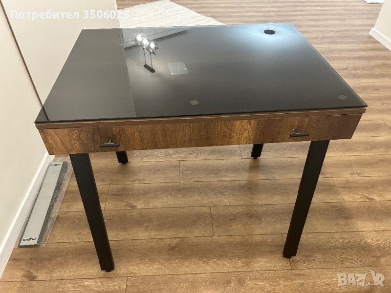 Продавам чисто нова маса с чекмедже. размери на масата ширина 1м, дълбочина 70см, височина 87. С метални черни крачета, повърхността е от черно стъкло което е подвижно.