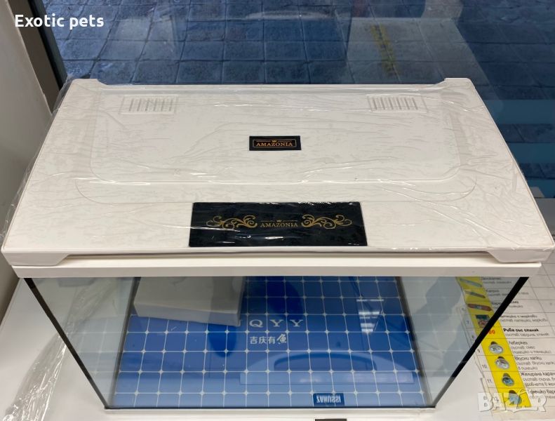 Продавам нов аквариум . Размер 60/33/49см. обем 97литра. За монтиране имайте предвид + 3 см от всяка страна и че капака се отваря нагоре. Капак с вградена светлина и филтрираща система. Стъкло клиър вижън.