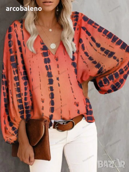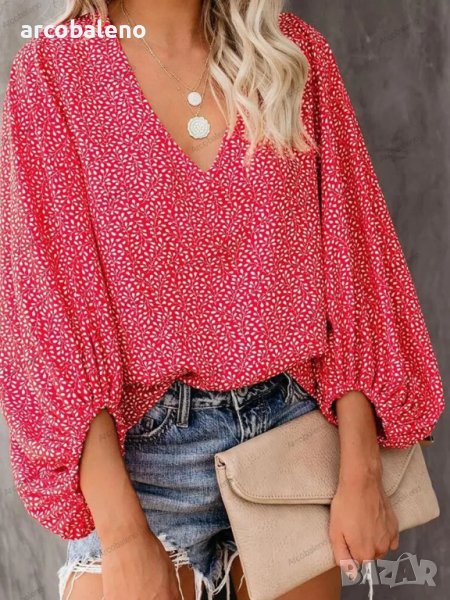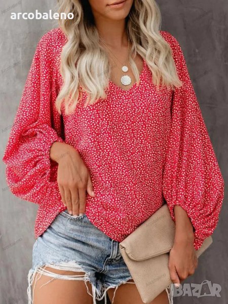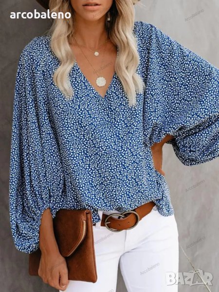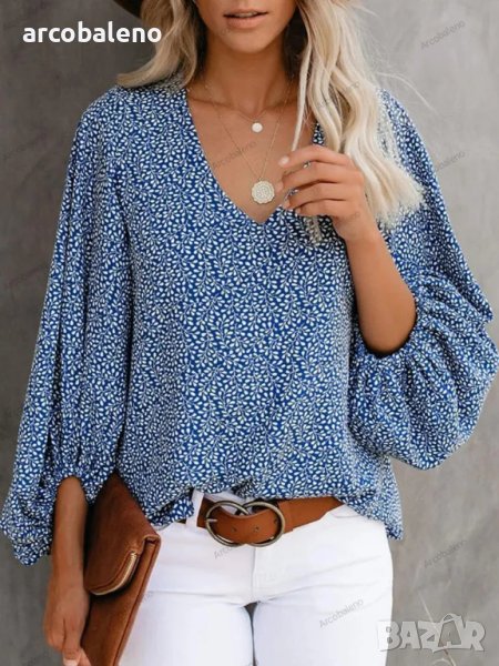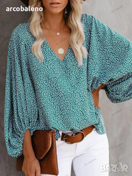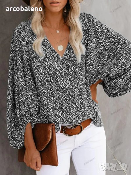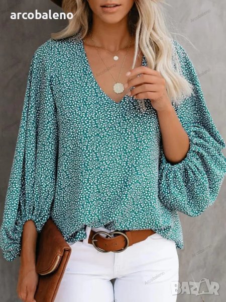 Дамска ежедневна риза с щампован фенерски ръкав с V-образно деколте, 9цвята
