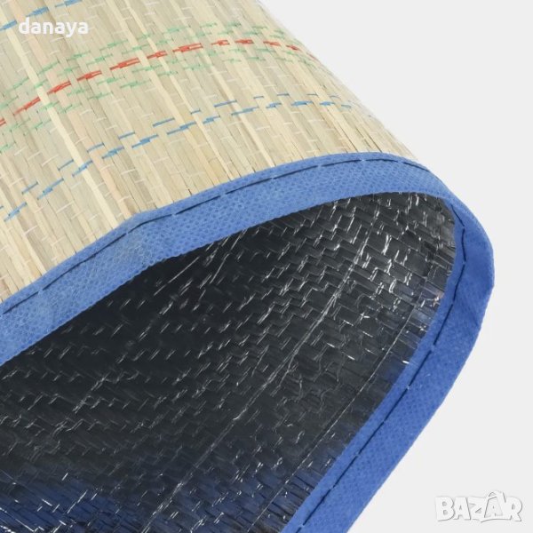 Двустранна рогозка за плаж, пикник или къмпинг, изработена от оризова слама, допълнително подсилена с фолио от задната си страна. Рогозката е сгъваема и лесно преносима, тъй като се превръща в чанта с дръжки, когато я сгънете. Налична в различен принт в лицевата си страна, когато рогозката се сгъне. Постелката за плаж е изработена от оризови сламки, осигуряващи комфорт при използване.