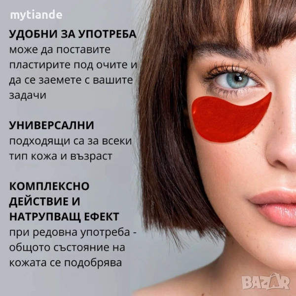 Нанесете пластирите върху почистената кожа на долните клепачи, като постигнете пълно прилягане. Оставете за 15-20 минути. За най-добри резултати се препоръчва да се съхранява в хладилник. Пластирите могат да се използват в областта на назолабиалните гънки и челото.