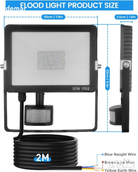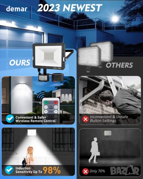PIR разпознаване на движение и режим на стабилно включване с регулируеми настройки. Дистанционно управление за лесна настройка и персонализиране. IP66 Водоустойчив и супер дълъг експлоатационен живот: Издръжлива конструкция от алуминиева сплав и закалено стъкло. 30W осигурява 3000 лумена, спестявайки над 85% енергия. Лесен за инсталиране: По-дълъг кабел, включени винтови фитинги, подходящи за различни външни зони.