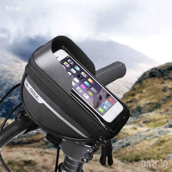 B-SOUL Водоустойчива чанта за велосипед 1L за захващане на кормило, предна горна рамка. Сензорен екран съвместимост с мобилен телефон под 6,5 инча. Вътрешно пространство, побира лични вещи, малка помпа за гуми, ремонтни комплекти, ключове, портфейл и др. Нова, фабрична опаковка!