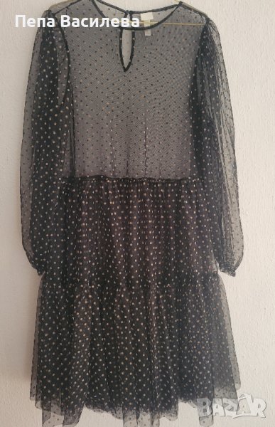 Ефектна рокля с богат набор в долната част. Красиви ръкави.Черна на бежови точки.Може да се носи с бежова подплата или с друг цвят по избор. Както и с къси панталонки.Няма да останете незабелязани определено. .Слагана един единствен път за около час.Почистена на химическо. Закупена от чужбина.