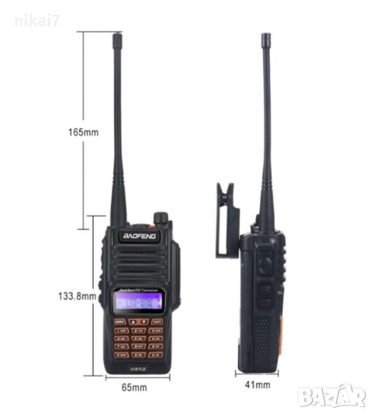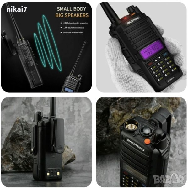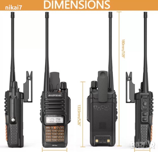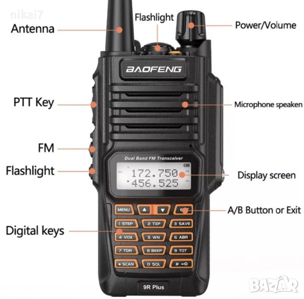 Baofeng UV-9R Plus 18вата моделът е с множество подобрения и иновации, увеличен обхват и дълготрайна батерия. Станцията е супер устойчива и херметична, изцяло ударо, прахо и водо устойчива. Уникална станция не зависеща от околната среда, влажност или запрашеност, която има възможност да следи и двете честоти едновременно – Simplex TDR function. Обхватът е забележителен – 30-40 км в гора или пресечена местност. Пряка видимост стига до над 60 км.Напълно подходяща за лов, риболов с лодки, къмпинг, ски, планинарство, охранители и служители на молове, ресторанти или търговски комплекси.Честотен диапазон VHF: 136-174MHz UHF400-520MHz