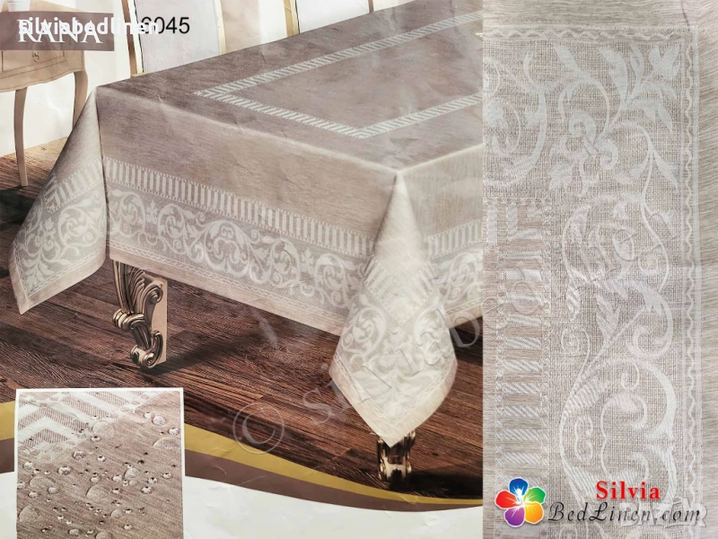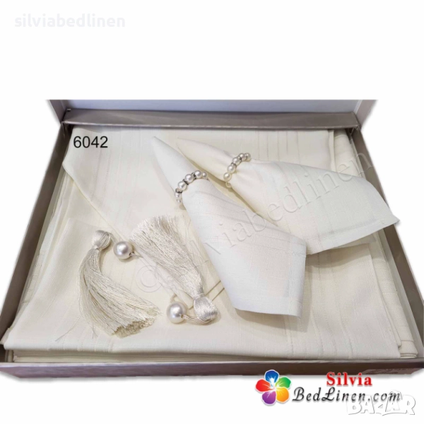 Покривки с код 6033, 6034, 6035, както и луксозния комплект 6039 от покривка, лента за средата на масата, 12 салфетки и 12 пръстена за тях, се произвеждат само с цвят крем и са от материя, която изключително много наподобява естествен лен, но материята е изкуствен лен. Това улеснява поддръжката на покривката, за да не се мачка и за да не задържа петна.
