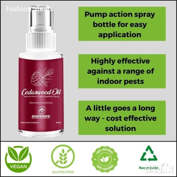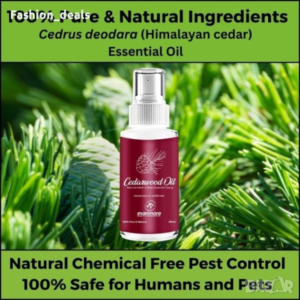 Предпазете дрехите, килимите, завесите и др. от различни вредители с този 100% натурален спрей за отблъскване на молци с масло от кедрово дърво. Този мощен разтвор предлага безопасен и безхимичен контрол срещу молци по дрехите и килимите, мравки и бръмбари по килимите. Използвайте естествените отблъскващи свойства на маслото от кедрово дърво, чиято ефективност се потвърждава от хиляди години.