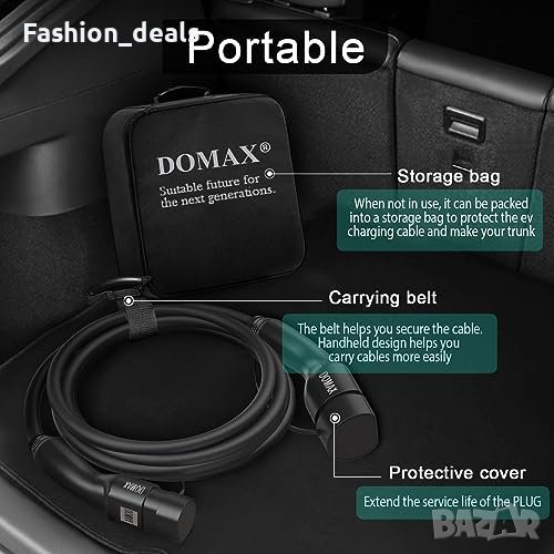 Кабелът за зареждане на EV на DOMAX предлага високоскоростно зареждане със стабилна ефективност на зареждане 32A, 22kW. Поддържа множество нива на мощност (съвместими в посока надолу), като 16A, 11kW, 7,4kW и 3,6kW.