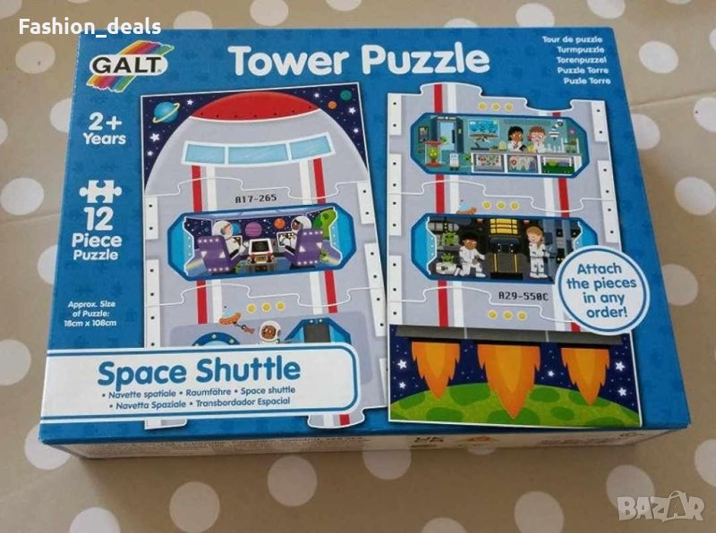 Пъзелът Galt Toys Tower - Space Shuttle е предназначен за запознаване с пъзела за малки деца. Състои се от изключително дълъг пъзел от 12 части с 10 специални части, които могат да се поставят в произволен ред, за да се създаде нова сцена всеки път. Тази функция добавя елемент на креативност към пъзела.