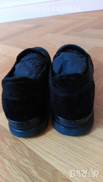 Сникърси Hogan, от групата на Tod's, Италия. Размер 38.5 - дължина на стелката 25.5 см. Цвят: черен. Материал: горна част от бляскав текстил, телешка кожа и велур. Хастар и стелка - 100% кожа. Подметка от гума. Отзад видно на петата е изписано логото на бранда. Платформата е 3 см. Обувките са много удобни за ходене. Купувани са от бутик на марката в чужбина за 390 евро. Обувани са само един път, нямат белези от носене. Аз съм напълняла и вече съм за поне 39 размер, затова ги продавам. Няма смисъл да отлежават в къщи в кутията. Сникърсите се продават в оригиналната кутия и текстилна торбичка.