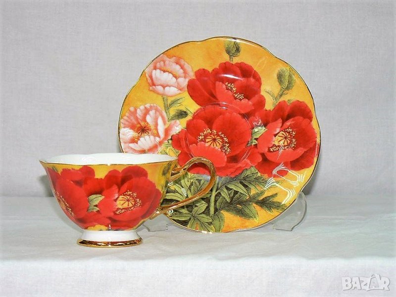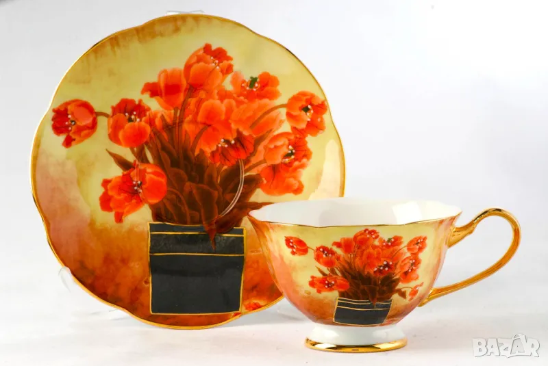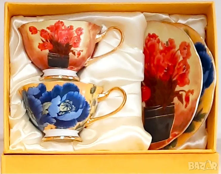 костен порцелан с красив цветен декор и златни кантове и дръжки. Предлага се в луксозна кутия за подарък.