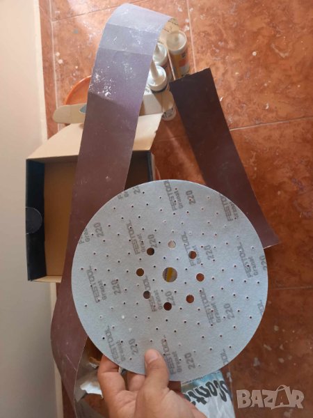 - Шкурки: кръгла на Festool 220 чисто нова за жираф + 3 бр. на Smirdex нови (кръгла P80; P150 - 55 см; P180 - 138 см) + гъба 150 нова + ъглова гъба 180 нова