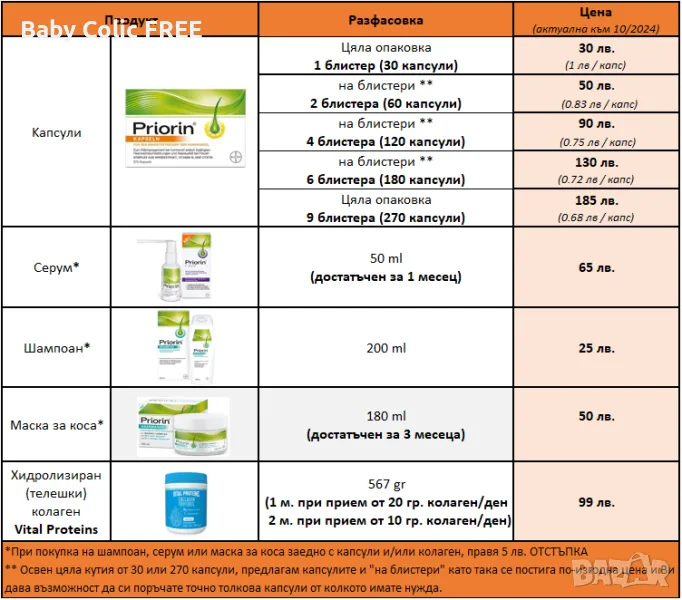 NB: При комбинирана поръчка на 2 или повече продукта Priorin (капсули, серум, шампоан или маска), правя 3 EUR отстъпка от крайната цена.