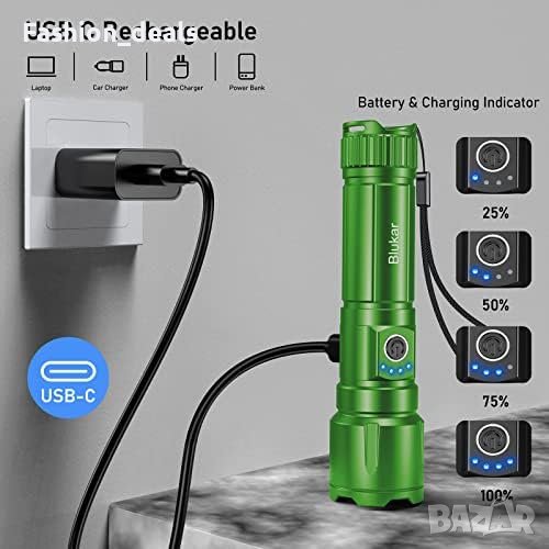 Включва тактическо фенерче Blukar, 3 батерии ААА, държач за батерии ААА, пластмасова тръба за батерии, кабел за зареждане USB C, защитен калъф за фенерче, ръководство за употреба и кутия за съхранение.