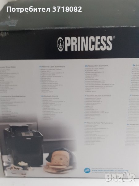 Princess152010-автоматична хлебопекарна .max тегло на хляба -907,2 гр. ,мощност 550w ,AC входно мапрежение-220-240V Машината е нова с отремонтиран транспортен дефект,счупено чопче на капака ,което е залепено.