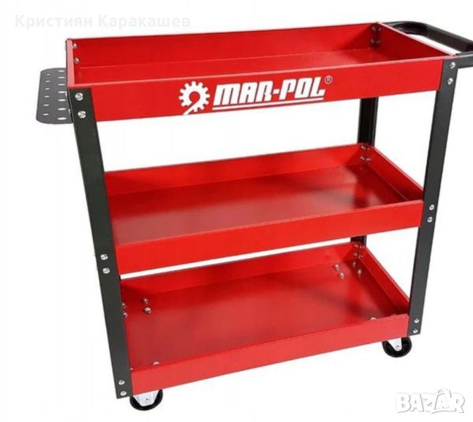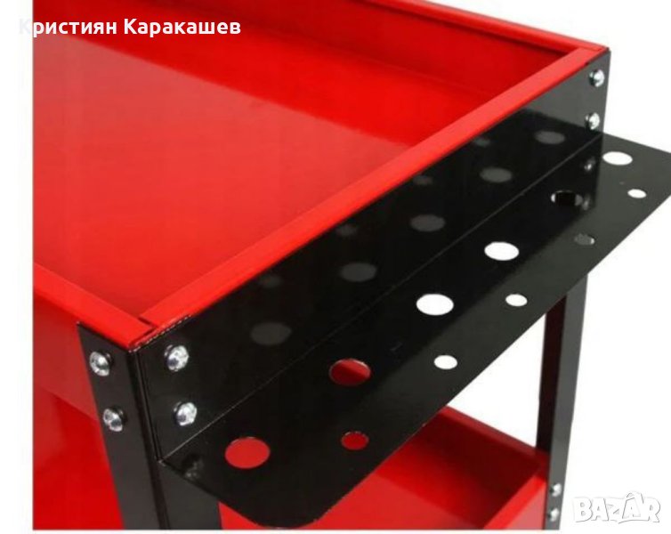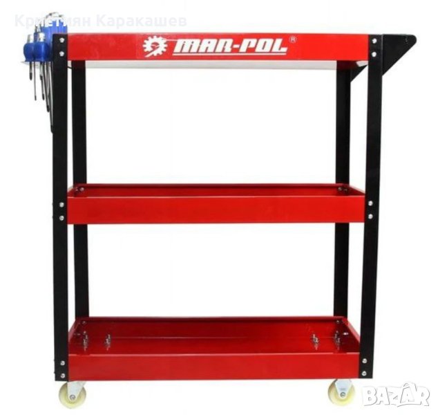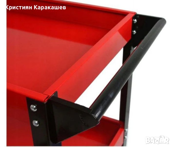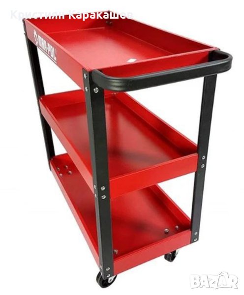 Стоманена количка с три рафта. Той е идеален за работилници, сервизи, Улеснява работата ви, защото винаги имате всеки инструмент под ръка. Оборудвана е с четири колела, две фиксирани и две въртящи се, и метална дръжка, която улеснява преместването. Количката може да се използва и за транспортиране на малки опаковки.