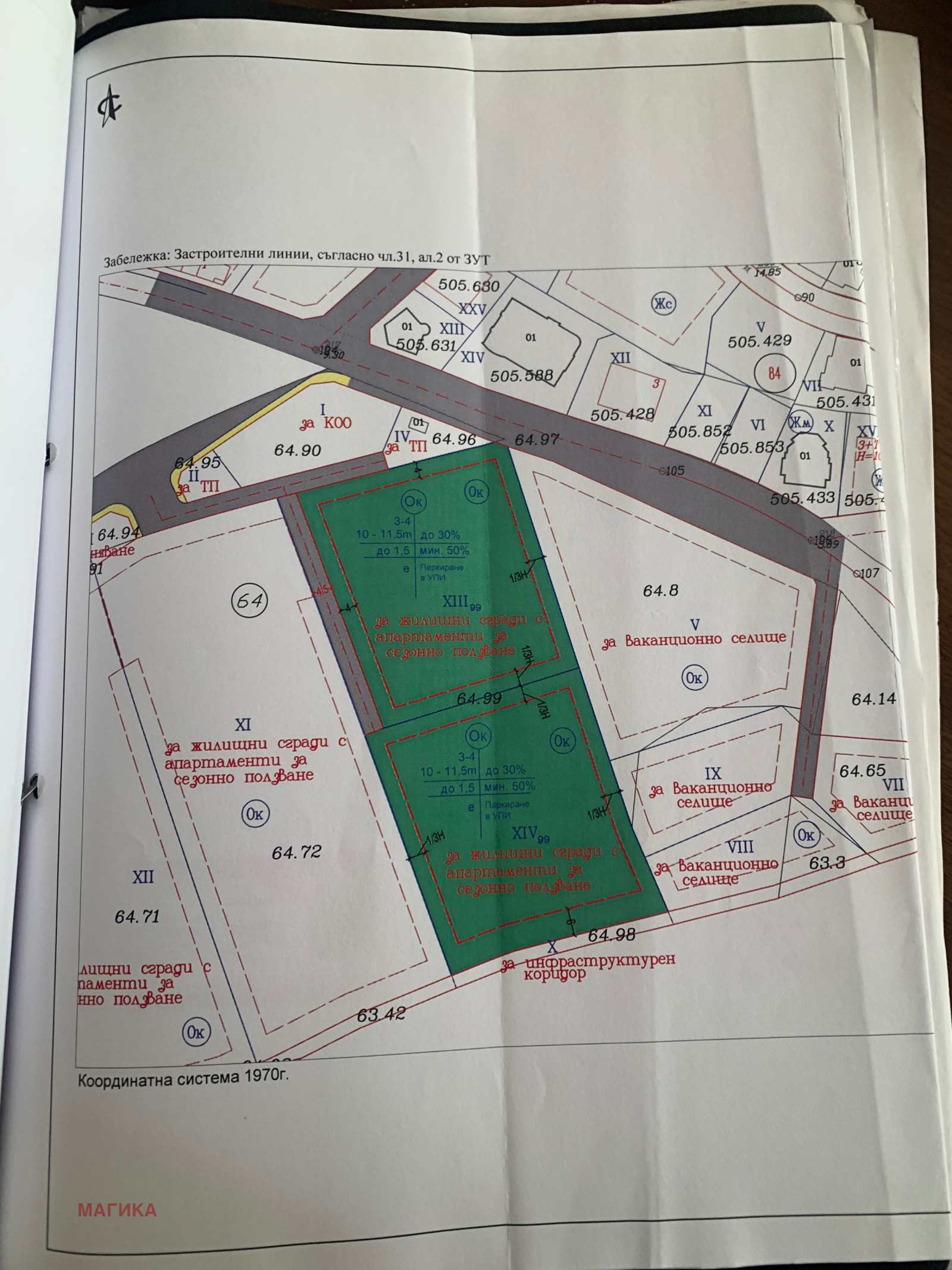 ЗА Жилищни сгради с апартаменти сезонно ползване. Показатели: кинт 1.5; плътност до 30 %; озеляняване мин.50 %; кота корниз 10-11.5 метра;