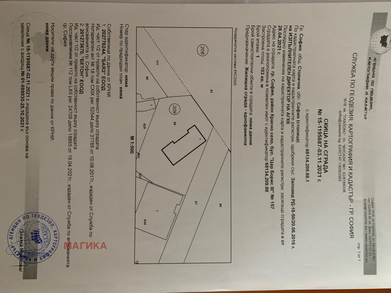 едноетажна жилищна сграда с идентификатор 68134.209.88.1 със застроена площ от 115 кв.м.,със съответните идеални части от правото на строеж,без дворното място,върху която е построена-КАТО ОТДЕЛНО ИМУЩЕСТВЕНО ПРАВО,с адрес на имота: област София (столица), община Столична, гр. София, район Красно село , бул. Цар Борис III 157;