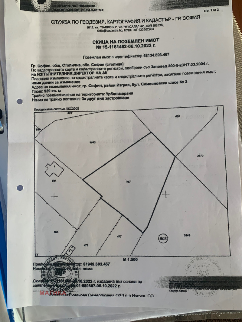 Поземлен имот 68134.803.467, област София, община Столична, гр.София,район Изгрев,бул. Симеоновско шосе 3, вид собственост частна,вид територия урбанизирана,НТП За друг вид застрояване,площ 939 кв.м.;Заповед за одобрение на КККР 300-5-23/17.03.2004год. на изпълнителния директор на АГКК, при съседи: 68134.803.841;68134.803.476;68134.803.477;68134.803.2448;68134.803.466;68134.803.2672;68134.803.1082