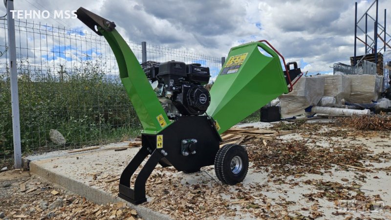 Нашият продукт е оборудван с: захранващ бункер, бензинов двигател с мощност 15 к.с., изпускателен канал, предпазна планка, 2 колела, 2 режещи ножа, 1 поддържащ нож, бутон за включване/изключване, кука за издърпване и опорна планка на шредера.