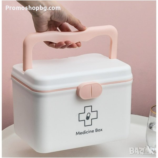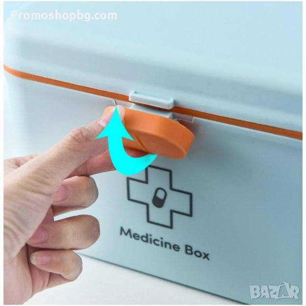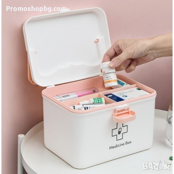 лекарства, или комплект за първа помощ у дома. Кутията е голяма и просторна, побира не само опаковки с лекарства, но и други медицински артикули като: превръзки, термометри и др., а благодарение на изтеглящите се рафтове можете да сортирате лекарствата си бързо и лесно.