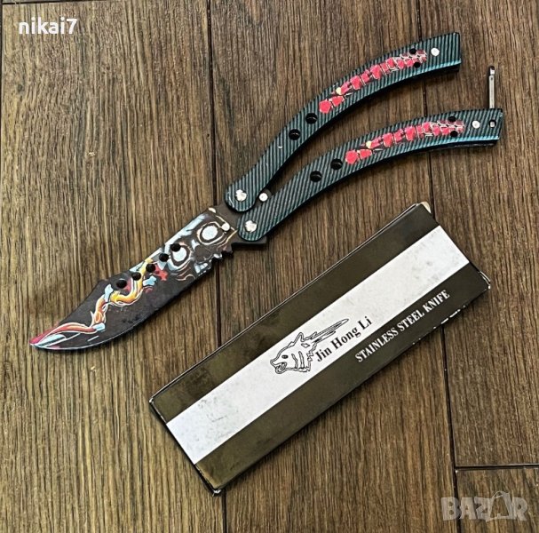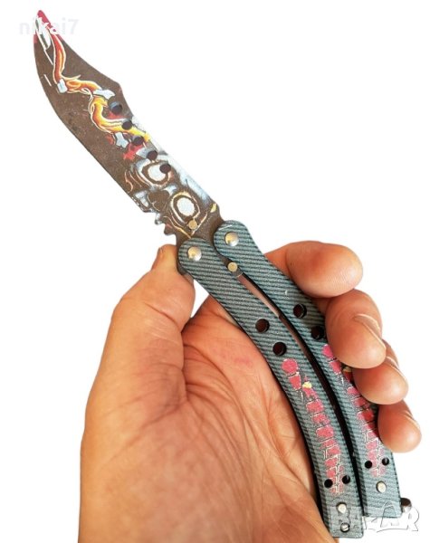 Мечта за всички CS играчи вече е реалност! Този нож пресъздава ножа на пеперудата от играта Counter Strike Global Offtack. Учебният нож е изработен от неръждаема стомана. Този нож НЕ СЕ ОПРЕДЕЛЕН И НЕ МОЖЕ ДА СЕ ОПРЕДЕЛЯ и не е опасен. Този нож е предназначен за обучение. Този продукт не може да бъде класифициран като истински нож и затова е легален във всички страни. Моля, обърнете внимание: уверете се, че ножовете са правилно затегнати и регулирани по всяко време. Технически подробности: обща дължина 24 см, дължина на острието: 13,5 см, затворена форма: 14,5 см, тегло 195 г, материал: стоманена пружинна ключалка обхват на доставка: нож за задвижване на пеперуда, чанта, подходящ винт Torx