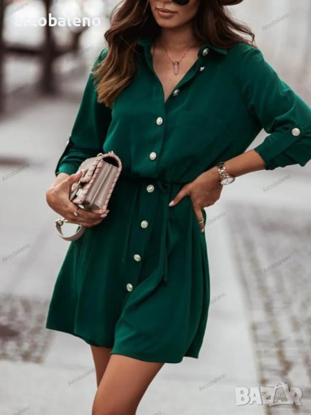 Дамска едноцветна рокля с копчета и връзки на талията с модерен стил и мека и удобна материя. Независимо дали е ежедневие, излизане, ваканция и т.н., може да се носи на машина или на ръка. Материята е устойчива на намачкване и на начупване. Размерът се измерва на ръка, като е нормално да има грешка от 1-3см.