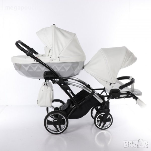 Двойно щастие, двойна радост и гордост, но и двойни задължения и предизвикателства. Junama MIRROR SATIN DUO SLIM от колекция Diamond е количка 2 в 1, която ще отговори на вашите очаквания. Мултифункционалната рамка ви позволява да монтирате гондола, седалка за количка и столче за кола. Създаването на система за пътуване 3 в 1 ви позволява да адаптирате количката към всяка ситуация. Външният подгъв на кабинката и количката с висококачествен водоустойчив материал улеснява премахването на всякакви петна. Впечатляваща е гланцовата гондолна купа с ефект на релефни диаманти. Широката гама от настройки в дълбоката и ходещата версия ви позволява да настроите количката според индивидуалните нужди на вашите деца. Вниманието към всеки детайл превръща всяка разходка в истинско удоволствие, независимо от терена и метеорологичните условия. Здравата и солидна рамка с широк набор от иновативни функции ви позволява да адаптирате количката към всяка ситуация. Това е само предвкусване, запознайте се с дълбоката количка Junama MIRROR SATIN DUO SLIM.