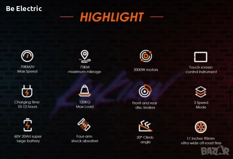 Максимален пробег с един заряд - 20ah батерия 50-70км. (Зависи от пътната обстановка и тежест на потребителя)