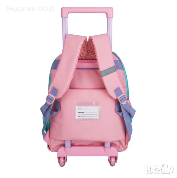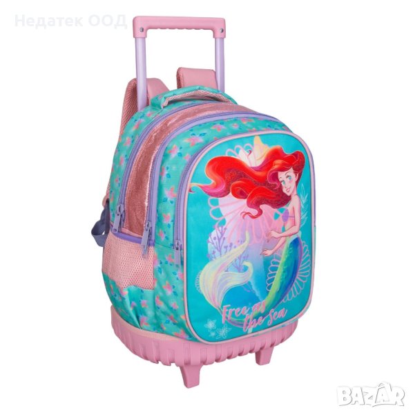 Ученическа раница с клелца, розов тюркоаз с дизайн Ariel и блестящи детайли. Има 2 големи отделения, един джоб, свободни пластмасови ципове с метални закопчалки и странични джобове с мрежа. Има дръжка тип P до 80см, етикет за детайлите на детето, колела с пластмасов капак за по-голяма издръжливост и меки светлоотразителни ленти.