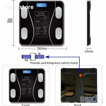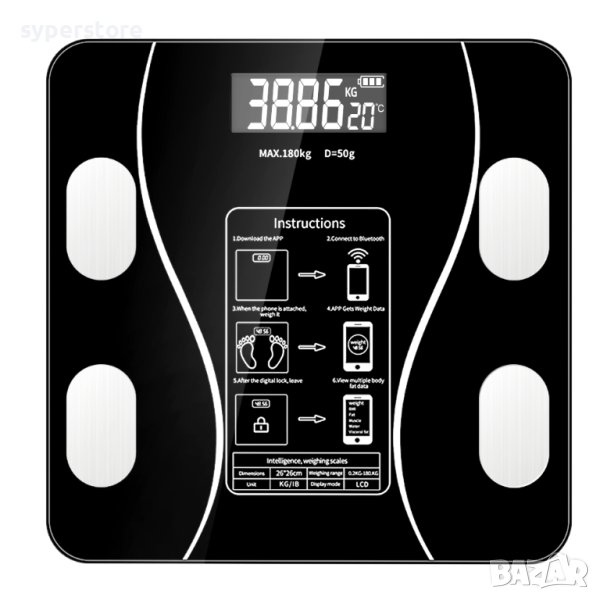 Проектиран да записва и показва състава на тялото и промените в теглото, да синхронизира състава на тялото ви с вашия смарт телефон и да следи вашите цели за здраве и тегло с надеждна точност и удобство. Може също да бъде свързана с вашия смарт телефон чрез Bluetooth 5.0 връзка.