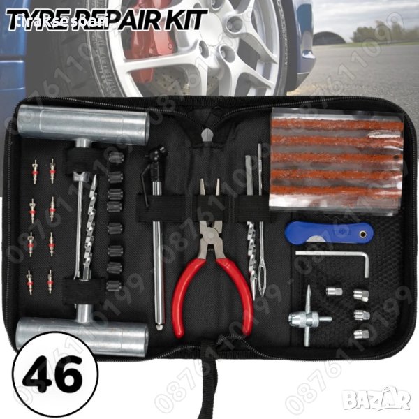 46 Части Ремонтен комплект за спукани гуми Фитили Клещи Капачки → Обява 42086845