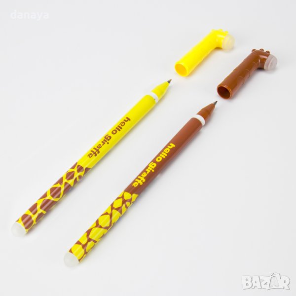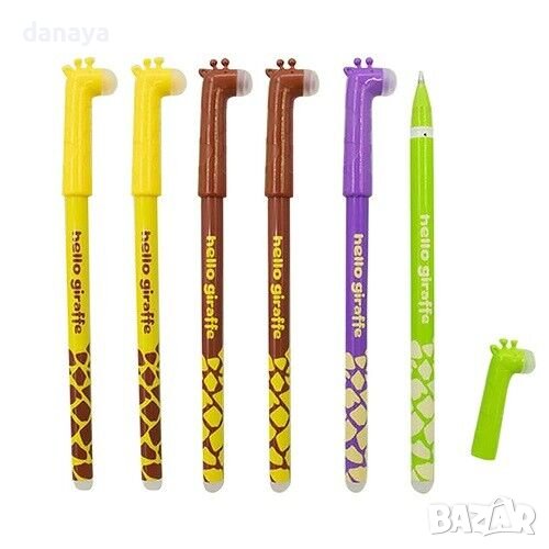 Изтриващ се син химикал с гума Hello Giraffe. Супер сладурски химикали, които ще се харесат страшно много на малките ученици. Химикалът пише в синьо мастило, а капачката му е с форма на жираф, чиято муцунка е гумичка. С нея детето ще може да изтрие лесно грешно написаното, без да оставя драсканици по листа хартия.