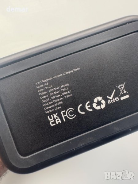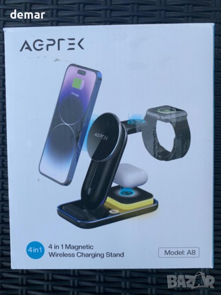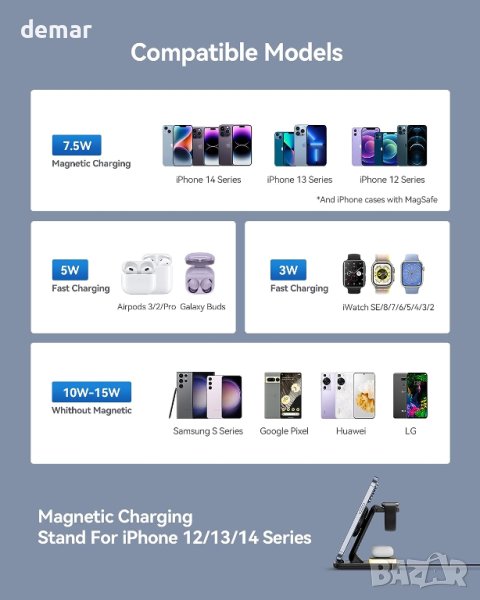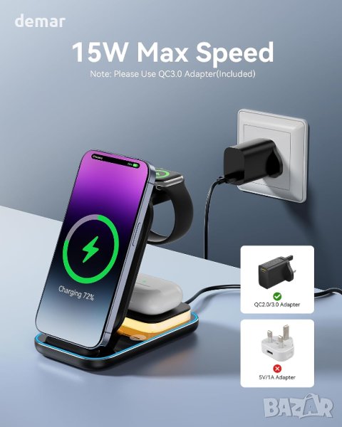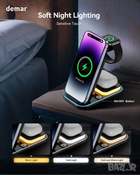 iPhone 11/10/9/8 , 5 W за AirPods 2/Pro и 3 W за iWatch SE/7/6/5/4/3/2. Включен адаптер QC3.0. Съчетава безжично зарядно устройство 4 в 1 с функция за нощна светлина. Регулируемото трицветно осветление осигурява удобство и безопасност на тъмно. Сензорното управление и ръчното изключване на светлинния индикатор го правят идеален за използване до леглото. Магнитният диск може да се регулира нагоре и надолу за различни по размер смартфони. Поддържа както вертикално, така и хоризонтално зареждане, което позволява завъртане на телефона на 360 градуса за дейности като видео разговори и гледане на филми. Съвместим с калъфи за телефони Mag-Safe и калъфи с дебелина до 8 мм. Оборудван с разсейване на топлината, защитни функции като прегряване, откриване на чужди обекти, защита на батерията и радиационно екраниране за по-бързо и по-безопасно изживяване при зареждане.