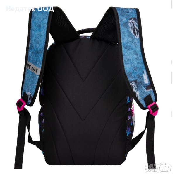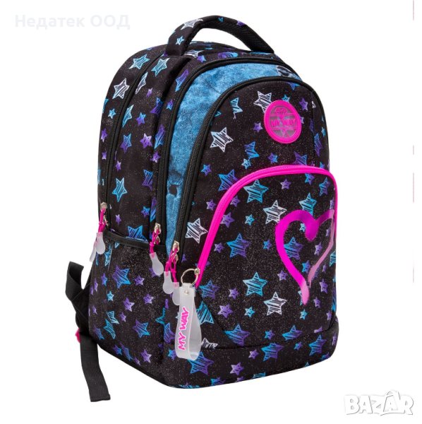 Ученически несесер, черен с дизайн на цветни звезди, със сърце във цвят на фуксия и сребрист блясък, 2 отделения и един джоб, здрави ципове, странични джобове, анатомичен гръб, ергономични презрамки и удобна дръжка.