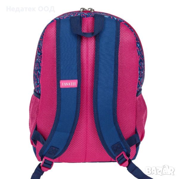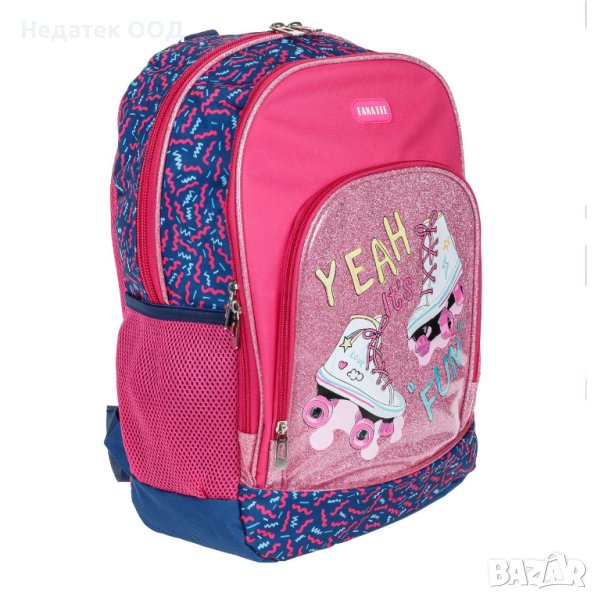 Ученическа чанта, розова с шарка на ролки, сини детайли и блясък.Има 1 голям джоб, 1 по-малък с вътрешен джоб и лична карта, 1 външен джоб и 2 странични мрежести джоба.Има издръжливи ципове с метални щипки и анатомичен гръб с меки сини презрамки.
