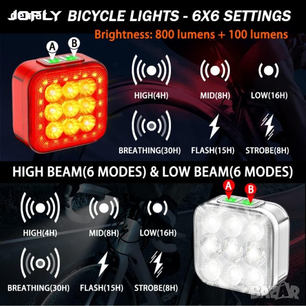 Качественият поликарбонатен пластмасов корпус с прозрачен дизайн осигурява отлична пропускливост на светлина. Осигурява видимост и безопасност на пътя с режими 6x6 за избор. 2 превключвателя с LED индикатори за ниска/висока яркост, бавно/бързо мигащи режими. Еднократно натискане за смяна на режимите, продължително натискане за изключване. Запомня последния използван режим. Батерии с голям капацитет (1400mAh отпред, 1200mAh отзад) с индикатор за изтощена батерия. Дълъг живот на батерията в режим "Slow Flash". Водоустойчив до IP65, подходящ за всякакви атмосферни условия. Включени монтажни ремъци за лесно закрепване към различни велосипеди, скутери и бебешки колички.