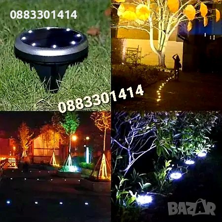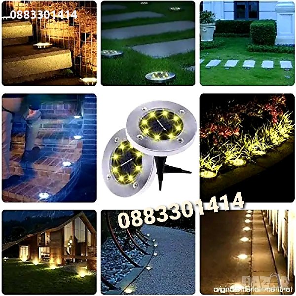 Соларна лампа за вграждане и декорация за алеи, пътеки, летни градини, поляни и басейни. Притежава слънчвев панел, който преобразува слънчевата енергия денем, в ярка LED светлина нощем. Разполага с 8 LED диони светлини и неръждаем метален корпус с водоустойчива защита IP44.