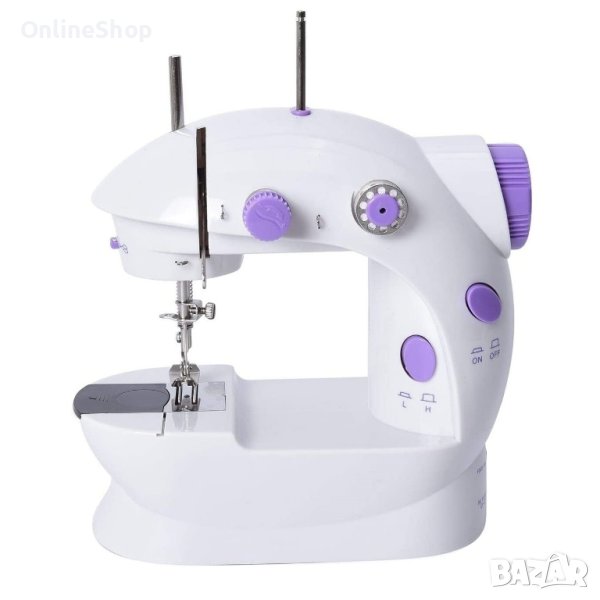 Изработена от пластмасов материал. Мини шевната машина е със стилен дизайн в бял цвят, лилави копчета: бутон за включване и изключване, бутон за скорост, бутон за пускане на осветление. Пристига с масичка за шиене, която осигурява удобство по време на работа. Масичката може да се маха и да се използва само машината.
