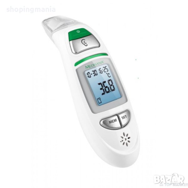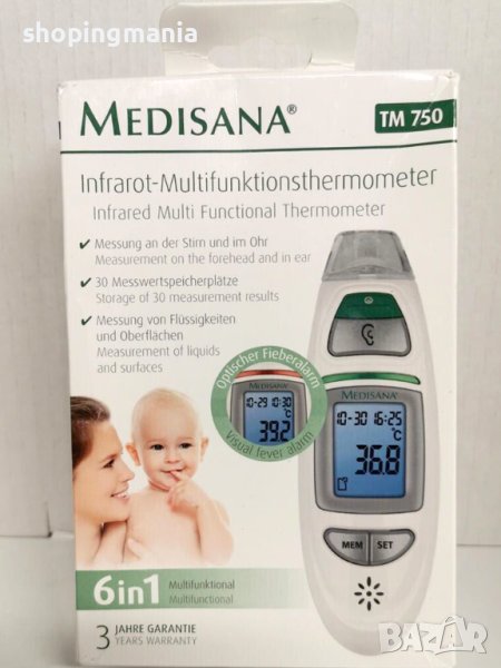 Инфрачервеният термометър от ново поколение Medisana TM 750, Ви предлга 2 вида измерване контактно и безконтактно. Контактно за телесна температура (чело и ухо) и безконтактно за повърхности, течности и околна среда. Показва резултата от измерването след секунди. Изключително компактен и лесен за употреба. Има голям дисплей и игнализира при треска. Алармата за висока температура, Ви помага по-бързо да отреагирате на високата температура. Автоматично запаметява последните 30 измерени стойности.