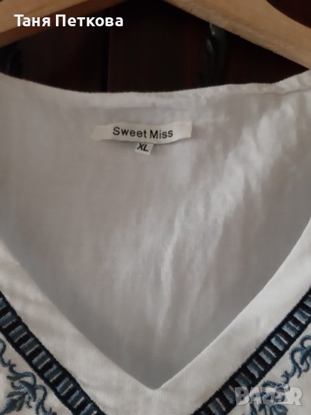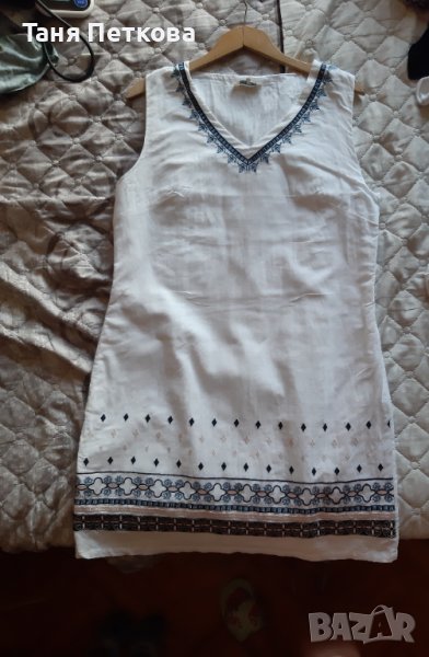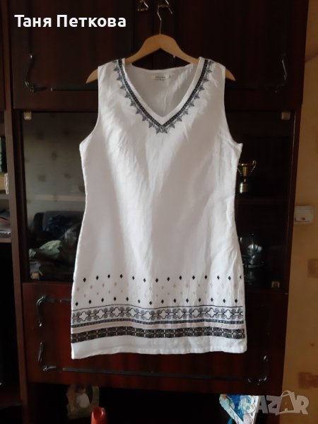 Дамска рокля без ръкав от лен.Роклята има подплата,цвят бял с бродерия тип шевици отпред. Закопчаване с цип странично,модела се разкроява малко надолу(А силует).Обличана два ,три пъти,XL размер.
