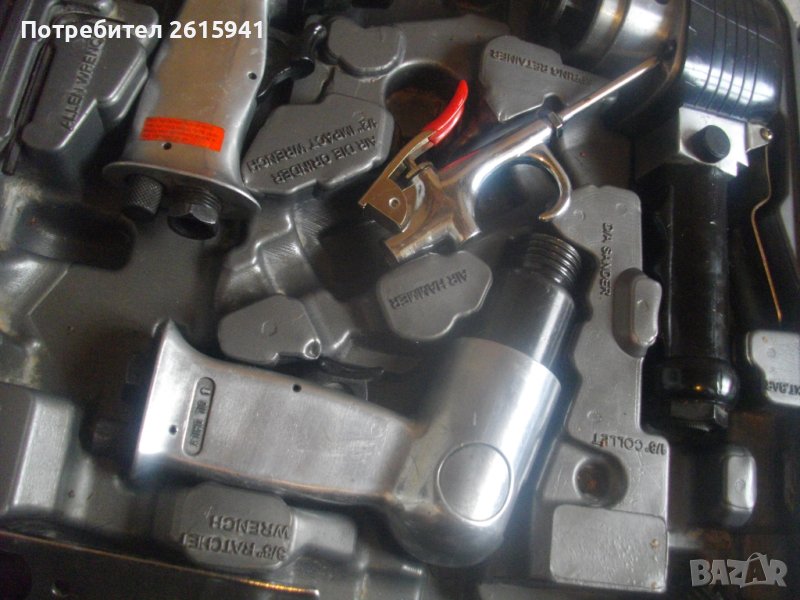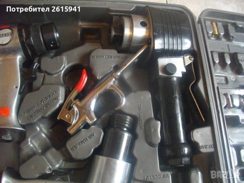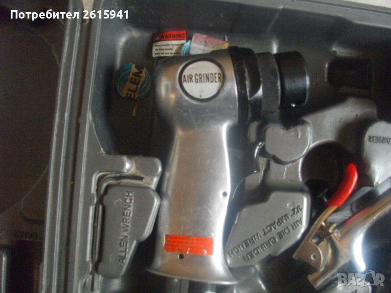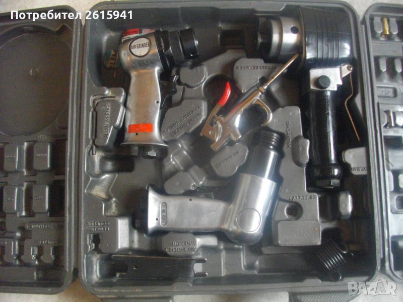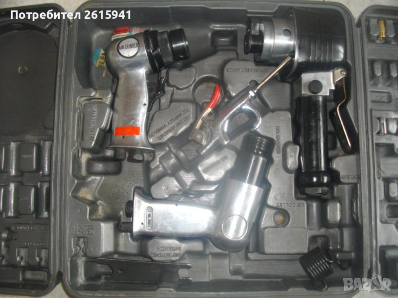 Комплекта в предлагания си вид включва: машина пнвматичен ексцентър вибро шлайф без пита/плот. Машина пневматичен къртач/секач, с прижината на главата. Машина пневматична AIR GRINDER с универсално приложение /отпред на главата могат да се навиват различни приставки на оста, която е с резба/. Инструмент четвърти в комплекта - пневматичен обдухвач със спусък.