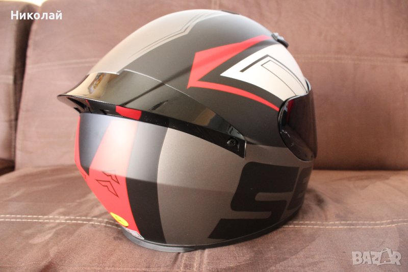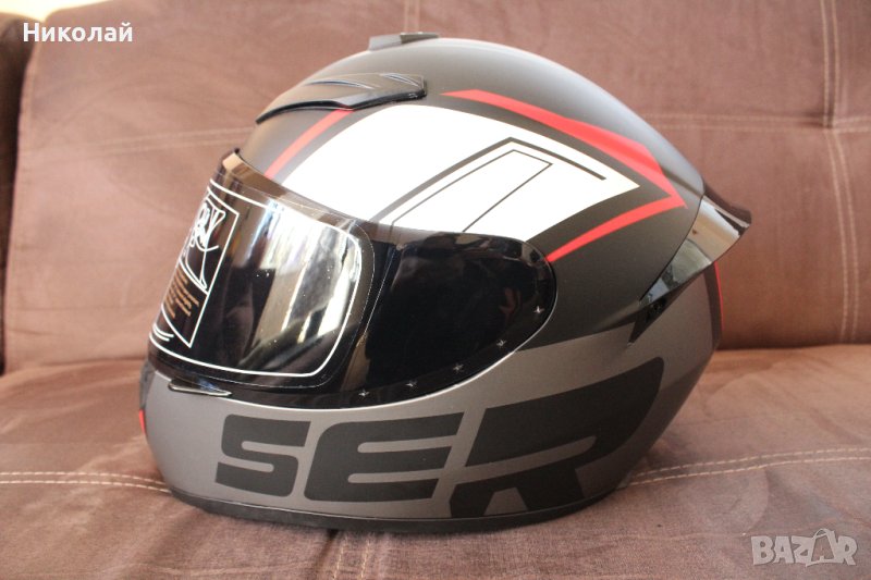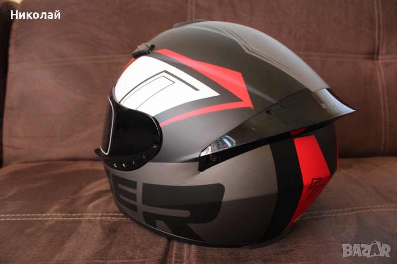 Нова каска QIKE. Размел XL(61-62см.). Моделът е с тъмен визьор със защита против надраскване и стандарт за сигурност DOT. Напълно премахваща и перяща се вътрешност на каската.