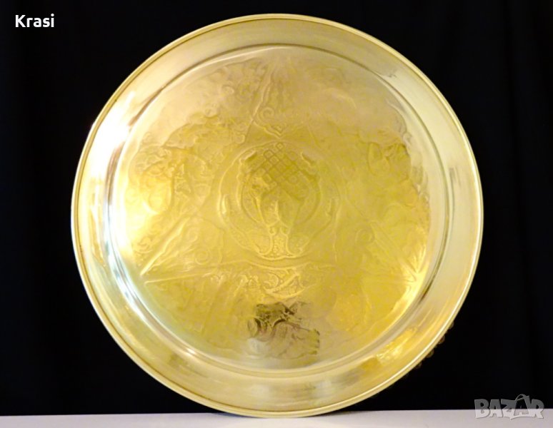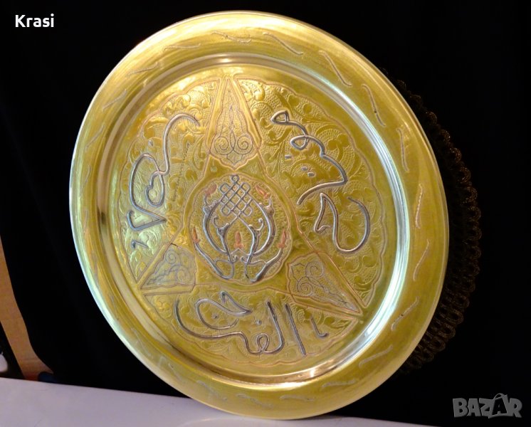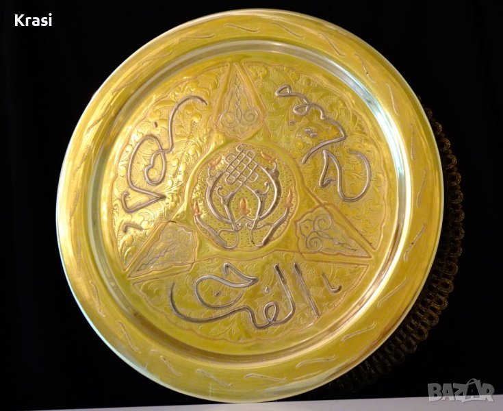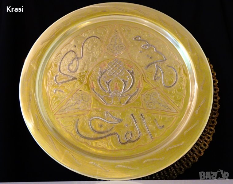 Старинен персийски поднос,плато,майсторска ръчна изработка от златен масивен бронз.Много сложна,виртуозна работа - сред богатство от релефни орнаменти има гравирано послание,арабска калиграфия,тугри със сребро.Не знам как,но на всичкото отгоре има вградена тънка медна нишка,която подчертава още повече красотата на цялото великолепие.Диаметър 34.5 см.,височина 2.5 см.,тегло 850 гр.
